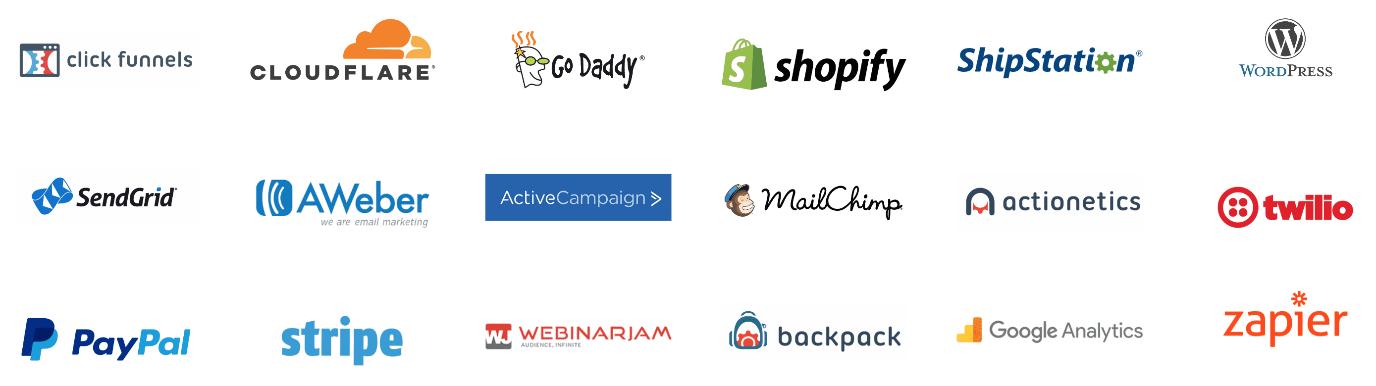 Custom Domain/Subdomain Issues; CloudFlare issues; Autoresponder integration; Google Analytics & Facebook Pixel integration; Actionetics, Backpack Fixes; Payment integrations (i.e., Stripe); ClickFunnels® Optin Form integration (into existing websites); Shopify and Zapier integration; SMTP integration (i.e., SendGrid); WebinarJam/EverWebinar Integration; and SMS Automation integration.